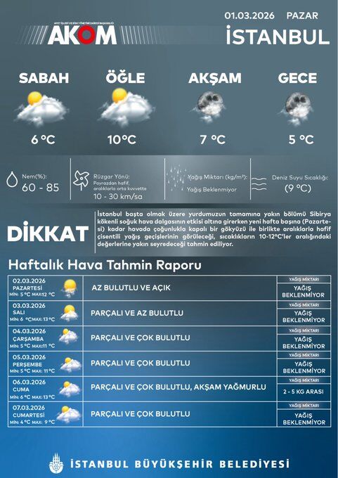 İstanbul Büyükşehir Belediyesi Afet İşleri ve Risk Yönetimi Dairesi Başkanlığı (AKOM), İstanbul ve çevre iller için kritik hava durumu uyarısını paylaştı. 1 Mart 2026 Pazar günü itibarıyla etkisini göstermeye başlayacak Sibirya kökenli soğuk hava dalgası kapıda. Peki, İstanbulluları önümüzdeki günlerde nasıl bir hava bekliyor?